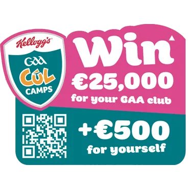 * ROI & NI only. Parental Permission for under 18s required. Internet access and participating pack required. Enter between 01.04.25 & 01.08.25 inclusive. Prize paid in Euros only. T&Cs and restrictions apply. For full T&Cs, visit gaa.ie/kelloggsculcamps
