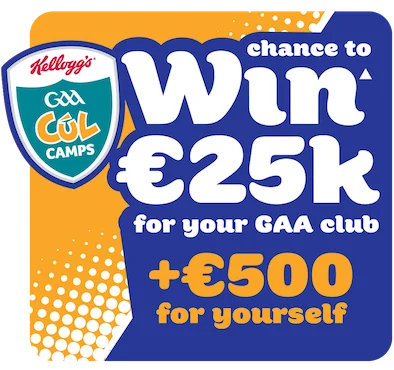 * ROI & NI only. Parental Permission for under 18s required. Internet access and participating pack required. Enter between 03.04.26 & 04.09.26 inclusive. Prize paid in Euros only. T&Cs and restrictions apply. For full T&Cs, visit gaa.ie/kelloggsculcamps